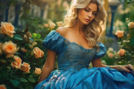 A Dreamy Blonde Enthralls the Rose Garden with Cute Details. Generative AI
