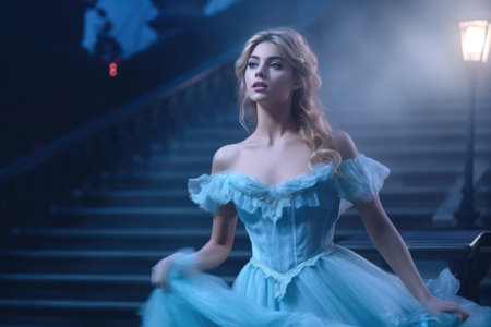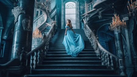 A woman in a blue dress walking up a set of stairs. Generative AI image.