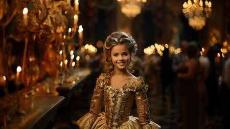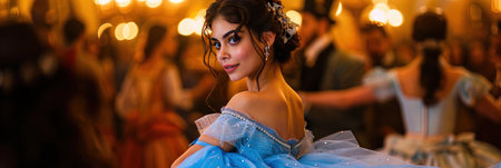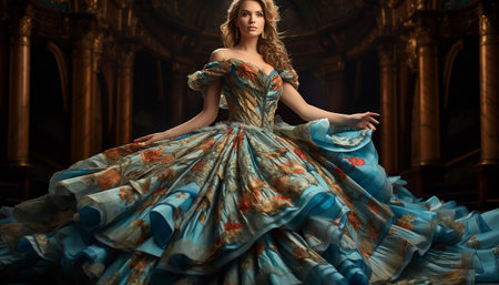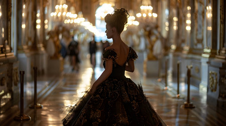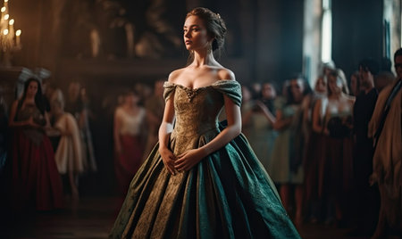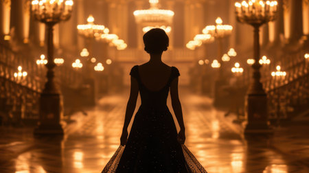 Glamorous woman in an evening gown, standing in a lavish ballroom,