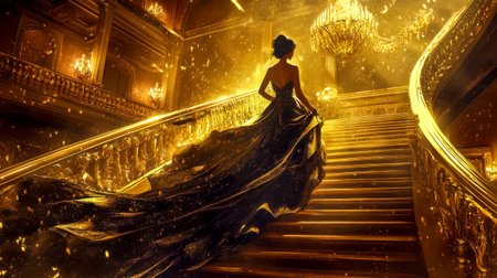 Elegant woman walking up stairs in luxurious golden ballroom wearing long gown