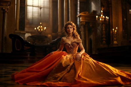 Beautiful young woman in a golden dress in the interior of the castle