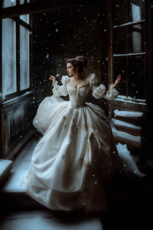 Elegant woman in a vintage white dress dances gracefully in a snow-filled room with large windows