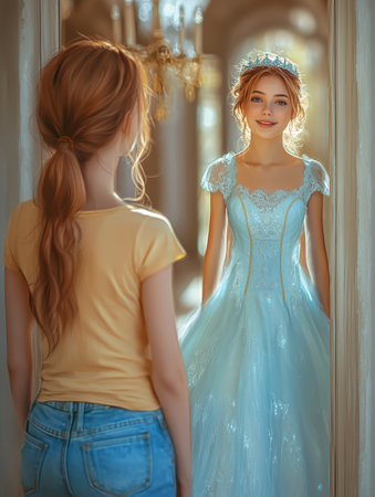 Young girl dressed in casual clothes stands in front of a mirror, where her reflection appears as a princess in a ball gown