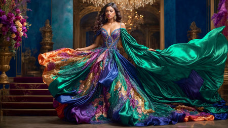 Fashion photo of a beautiful woman in a luxurious evening dress with colorful fabric.