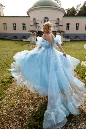 Woman in light blue ball gown runs along a path against the backdrop of a historic estate.Back view.