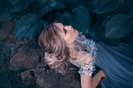 Blond girl, with a beautiful gathered hairdo. Pink hair is not long. Princess gray-blue unusual dress. Portrait on a tropical plant background, close-up. Art photo in cool shades