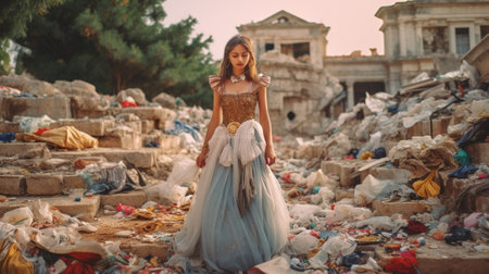 Young woman in a blue dress is standing on a pile of garbage