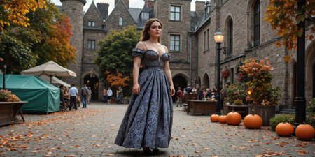 A woman in a flowing medieval gown, walking through a castle courtyard decorated with pumpkins and torches, as knights and villagers prepare
