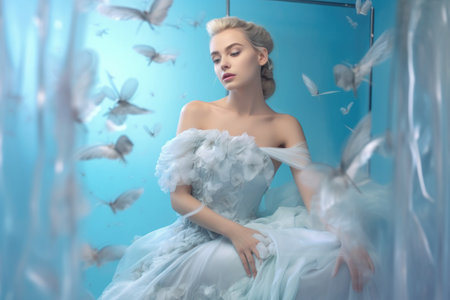 Ballerina in a stunning butterfly dress surrounded by a whimsical flutter
