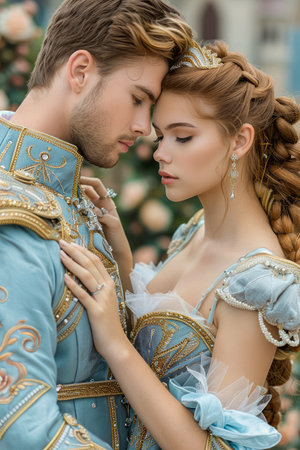 Romantic Fairy Tale Couple Embracing in Elegant Historical Costumes with Floral Background AI Generative