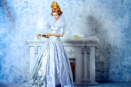 Elegant young woman in a lush white medieval dress with hair in the style of the Renaissance. Beautiful Ice Queen in her snow palace.