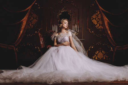 Portrait of a charming bride woman in a beautiful wedding dress. Luxurious vintage apartments.