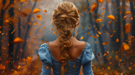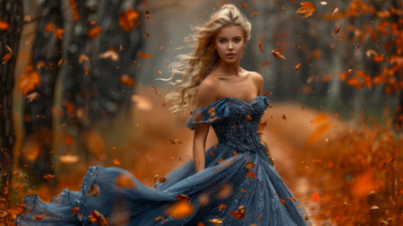 Autumn or fall season. A beautiful woman in a blue dress standing , leaves falling around her. She has long blonde hair and is wearing an elegant gown that flows elegantly on its own.