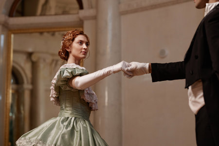 Portrait of beautiful young lady wearing ballgown and dancing with gentleman partner in palace, copy space