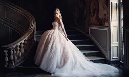The fashion portrait captures the beauty of a blond-haired bride. Creating using generative AI tools