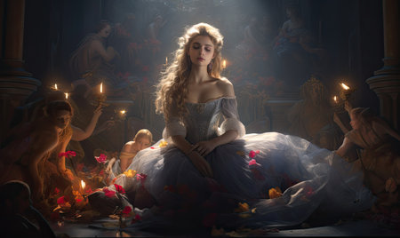 A woman in a ball gown surrounded by candles