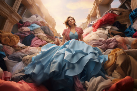 A girl in a fashionable dress on huge piles of unnecessary clothes. The problem of overproduction, irrational consumption and environmental pollution.