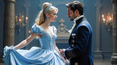 A beautifully dressed couple engages in a romantic dance in an opulent ballroom. The lady wears a light blue gown, while the gentleman is in formal attire, surrounded by candle-lit ambiance.