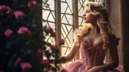 A fairy tale princess can be seen gazing out of a window in a pink turret of the castle.