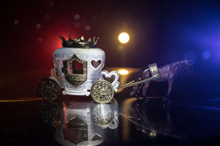 Little carriage with horse miniature on table. Creative decoration on dark toned foggy background. Selective focus
