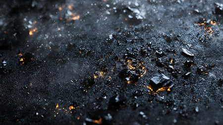 Rough black sand texture with glowing lava fragments under low light conditions