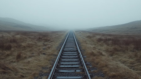 An atmospheric view of an abandoned railway track disappearing into a foggy horizon, surrounded by lush grass and rolling hills, evoking a sense of solitude and tranquility.