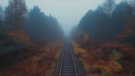 A stretch of railroad tracks disappears into a foggy landscape surrounded by colorful autumn foliage and dense trees, creating a serene and tranquil atmosphere.