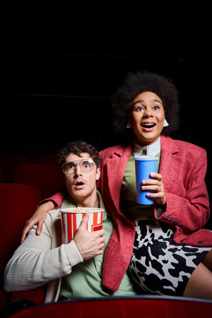 shocked multicultural couple in retro attires watching movie at cinema on date on Valentines day