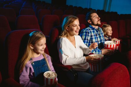 Young caucasian family watching a film at a movie theater, house or cinema. Look expressive, astonished and emotional. Sitting alone and having fun. Relation, love, family, childhood, weekend time.