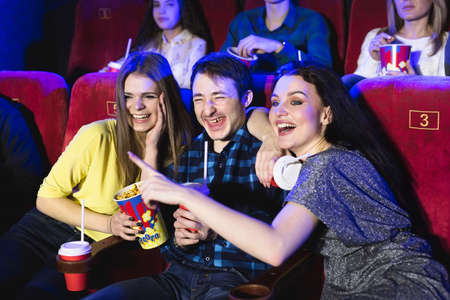 Two young girls and a guy watching a comedy in a cinema. Young friends watching movie in cinema. Group of people in theater with popcorn and drinks.