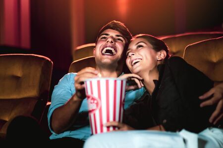 Happy loving young couple with popcorn enjoying a comedy movie together at the cinema. Loving couple spend weekend free time together.