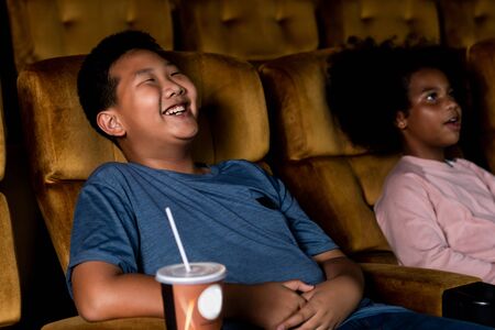 Audience is happy and exciting in movie theater cinema. Group recreation activity and entertainment concept.