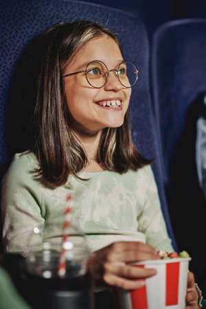 Vertical medium portrait of girl having fun watching comedy movie and eating popcorn at cinema