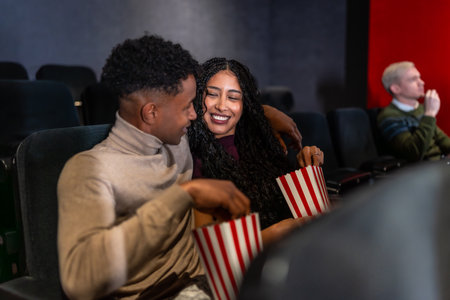 Happy couple enjoying a film in a cozy movie theater, sharing popcorn and laughing together, creating joyful memories on their night out