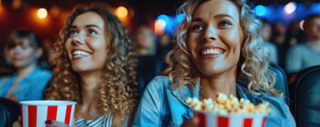 two women watching movie in cinema, eating popcorn. ai generated