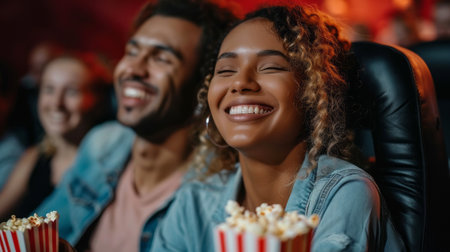 Laughing buddies watching a movie Generative AI, watching a movie, and popcorn