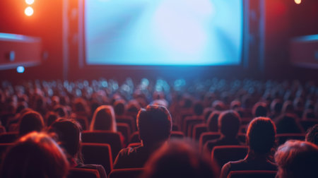 A snapshot of a bustling cinema hall brimming with an enthusiastic crowd, ready to enjoy the magic of cinema, as the movie screen glows, marking the beginning of a captivating story