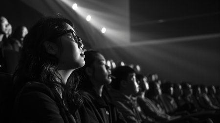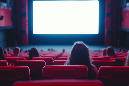 An audience in a cinema, focused on a bright screen in a dark room