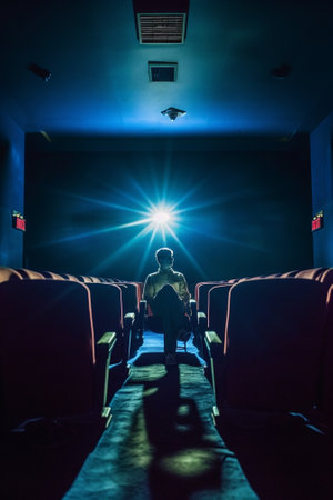 Man pirating at the cinema Young man shooting with his home video camera while sitting at the cinema : Generative AI