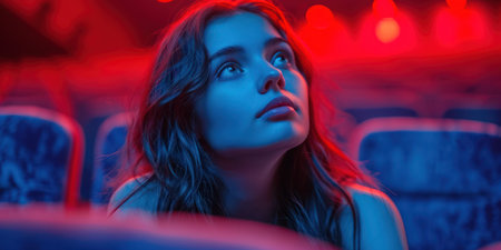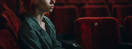 panoramic shot of young woman sitting in cinema chair and looking away.generative ai