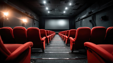 A striking image of an empty movie theater showcasing rows of vibrant red seats and a large projection screen, ready for cinematic enjoyment.