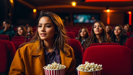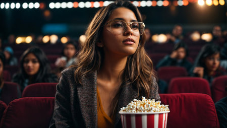 Young woman is enjoying a movie at the cinema, surrounded by other people