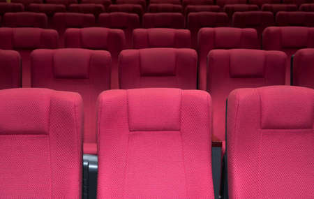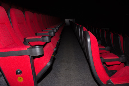 Cinema theater hall inside, red chairs. Empty cinema hall
