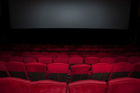 Empty cinema auditorium with rows of red and black seats facing blank projection screen, modern movie theater interior before screening, entertainment and event venue concept; low key shot