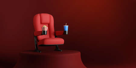 Cinema seats single stand on red carpet. Buy movie ticket concept, movie night. 3d rendering.