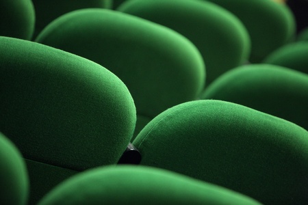 Empty auditorium of cinema or theater. Row of armchairs. Abstract toned background with selective soft focus.