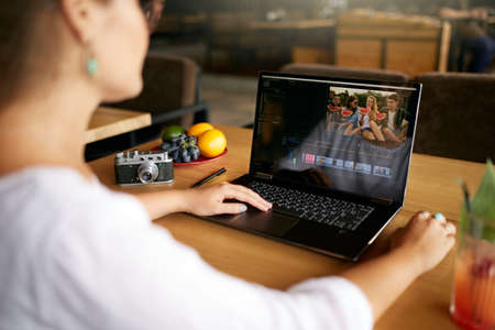 Freelancer video editor works at the laptop computer with movie editing software. Videographer vlogger or blogger camera man at work editing vlog. Tracking and revealing shot