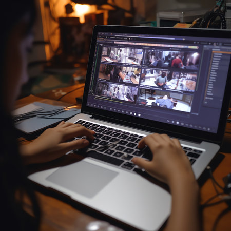 A pair of hands typing on a sleek laptop, surrounded by multiple screens showcasing diverse multimedia content, illustrating a creative and tech-savvy workspace.