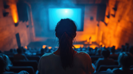 A captivating cinematic experience unfolds as an audience gathers in a dimly lit theater. The blue screen projects images, creating a mesmerizing ambiance enhanced by warm orange lights. Viewers are absorbed in the film, seated comfortably.