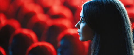 A captivating profile of a woman in soft focus against a red-lit audience. The image evokes contemplation and emotion, perfect for themes of solitude and reflection.